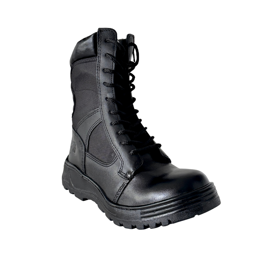 Bota de piel negro con lona, tipo swat mod. 888, forro acolchonado, amplio bullón, bolsillo y cierre lateral, velcro ajustable. alto de 23 cm (+/-2 cm), casquillo de poliamida. Tallas #23 al #31