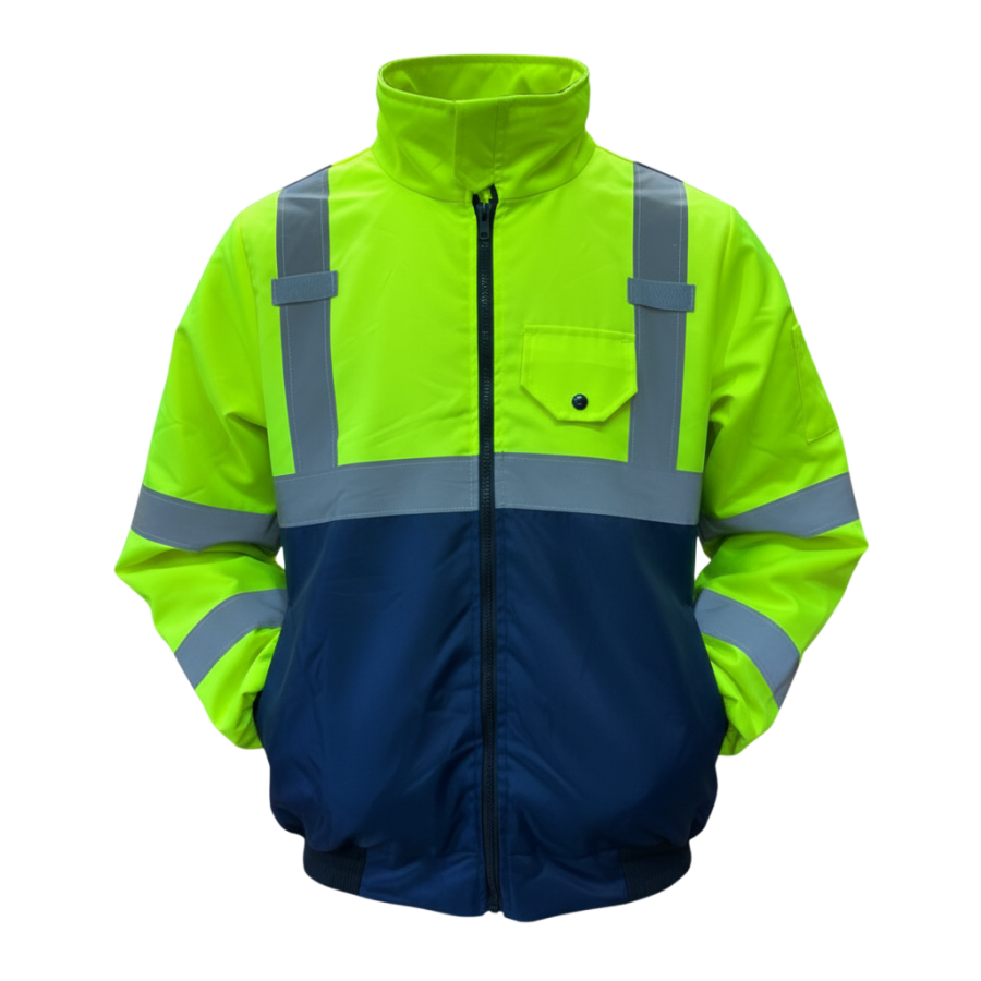 Chamarra Reflejante, Polar, Bicolor, Repelente. Color Amarillo Neón Con Azul Marino. Forro Interno Polar y Material Exterior Repelente Al Agua. Con Reflejantes de 2" Color Gris. Con Capucha Enrollable en Nuca y Desprendible, Con Jaretas Ajustables. Con Dos Bolsas Frontales Con Cierre y Ceja y un Bolsillo de Radio. Con Puños Textiles Elásticos. Tallas CH, M, G, XG, XXG. (Disponible en Color Naranja/Azul Marino Sobre Pedido).