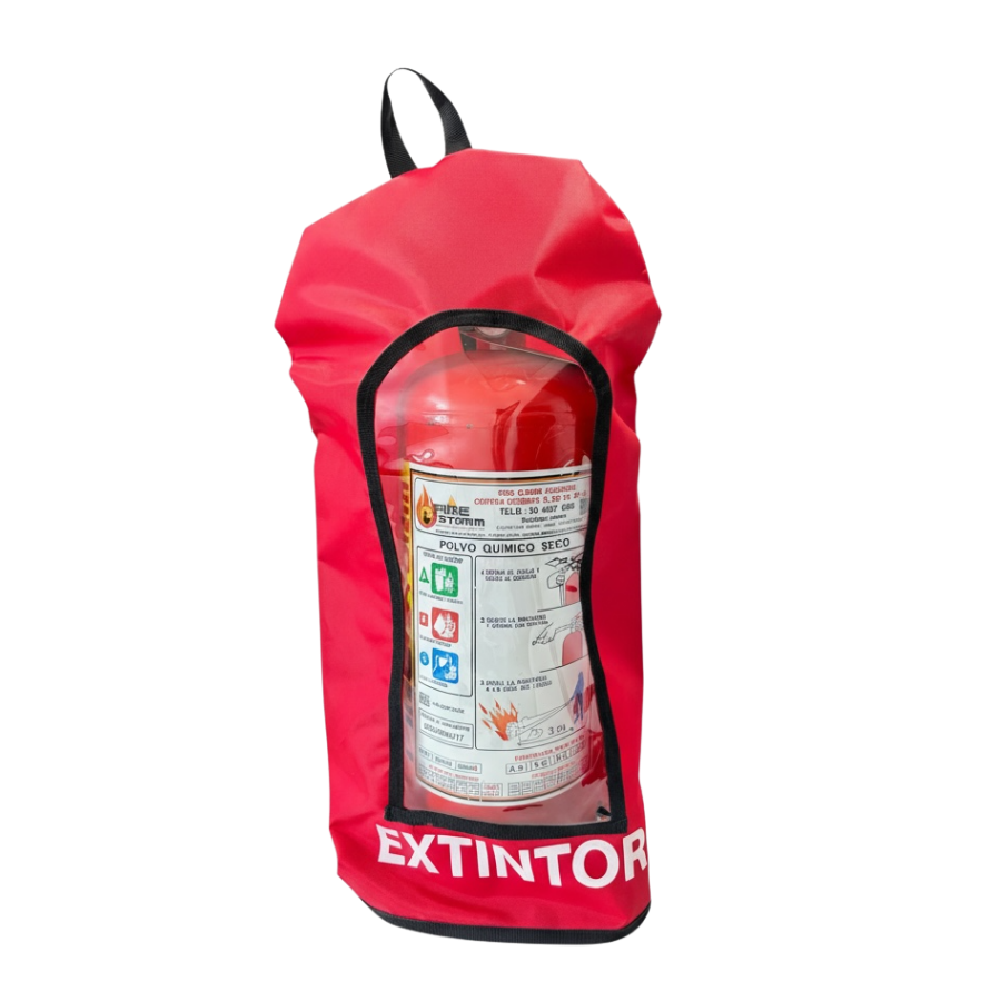 FUNDA PARA EXTINTOR. FABRICADA EN LONA Y PLÁSTICO, CON LEYENDA "EXTINTOR" SERIGRAFIADA EN COLOR BLANCO. CON BROCHE VELCRO. PARA EXTINTORES DE PQS DESDE 4.5 KG HASTA 9 KG. MEDIDAS ALTO 48 X ANCHO 32 CM.