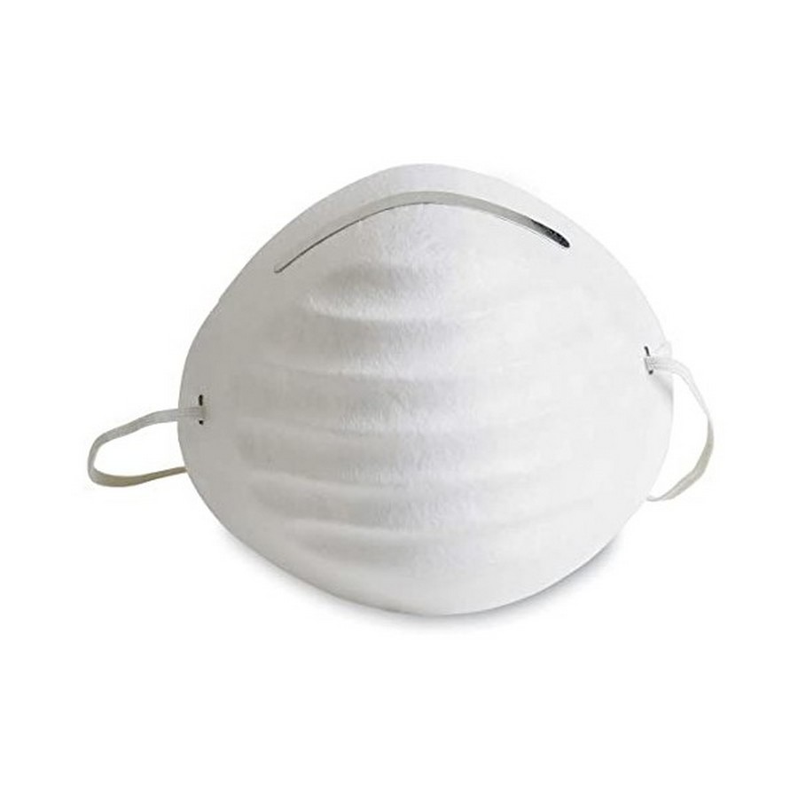Mascarilla tipo concha para polvos. Fabricado en polipropileno con clip nasal de aluminio y cinta elástica. Paquete con 50 piezas.