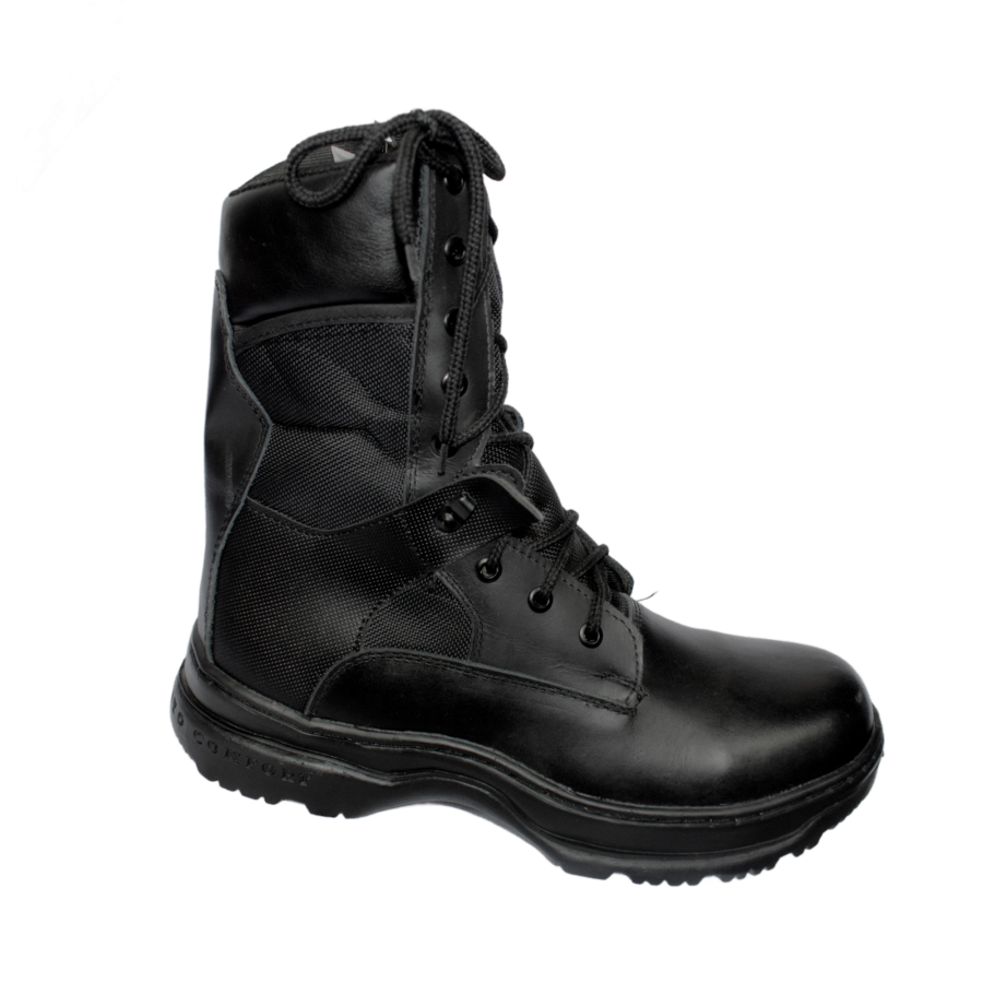 Bota de piel negro con lona, tipo swat mod. 888, forro acolchonado, amplio bullón, bolsillo y cierre lateral, velcro ajustable. alto de 23 cm (+/-2 cm), casquillo de poliamida. Tallas #23 al #31