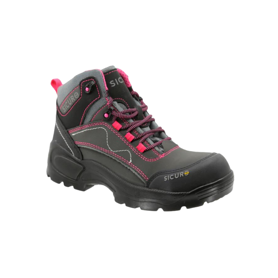 Calzado tipo borceguí mod. dibase SI50, tecno cuero acabado nobuck color rosa y gris con lona textil, forro textil, protección sintética en puntera y talón, lengüeta tipo ala de murciélago, detalles reflejantes, agujeta bicolor, casquillo de poliamida. Tallas números enteros #22 al #27