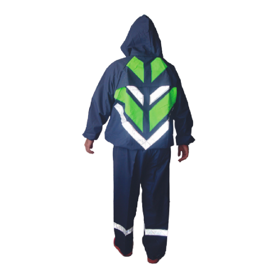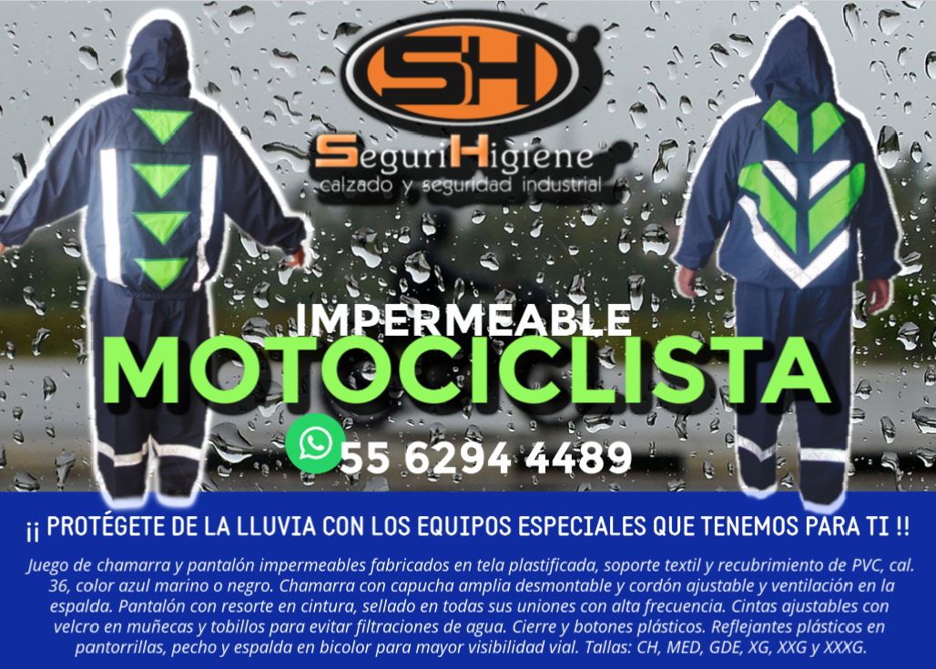Juego de impermeable pvc cal. 30 mm para motociclista, chamarra con capucha y pantalón con resorte en cintura. Reflejantes de alta visibilidad. Cintas ajustables en muñecas y tobillos. Colores: azul marino o negro. Tallas: M, G, XG (nacional)