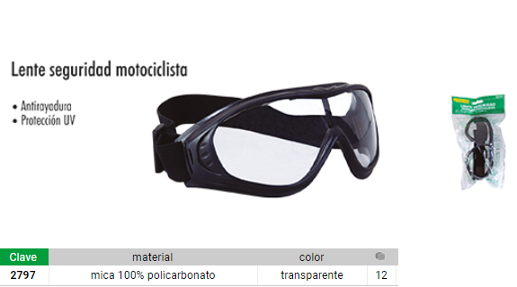 Lente estilo motociclista de policarbonato antirrayaduras, protección UV. Con elástico ajustable.