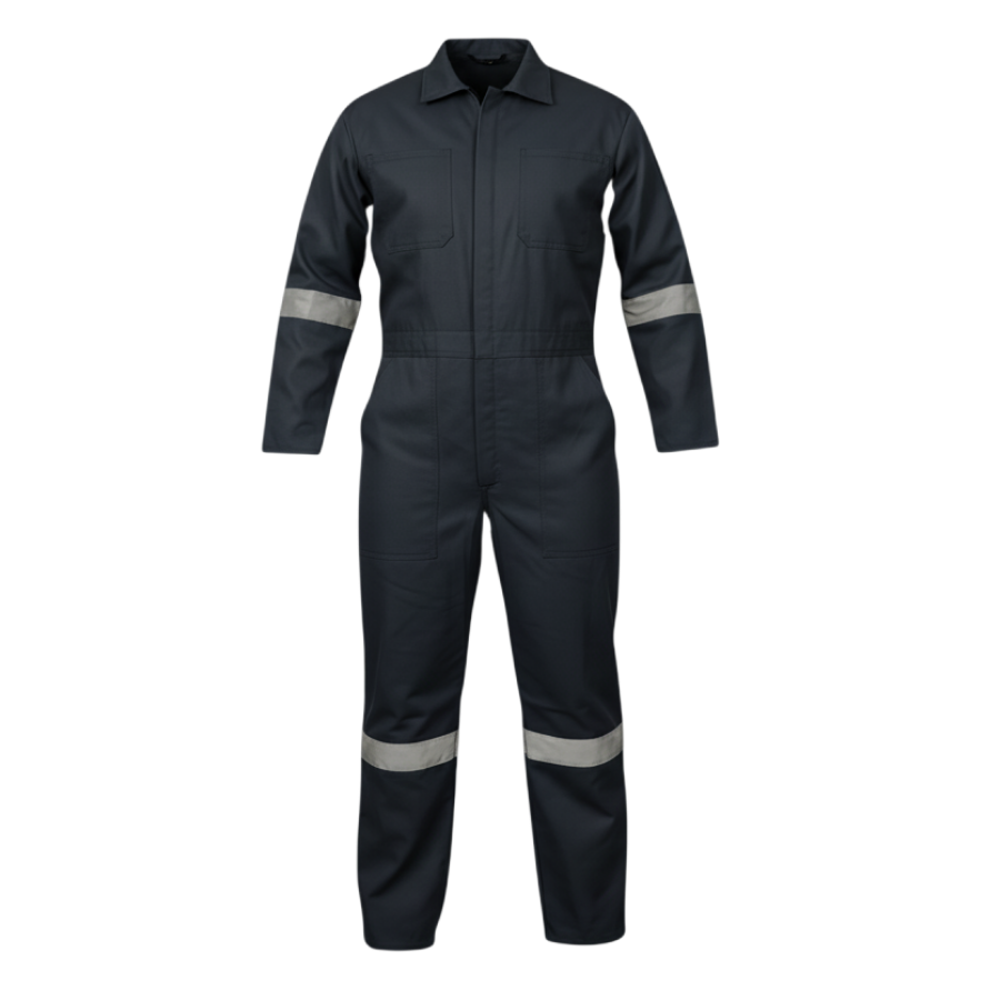 Overol 100% algodón con reflejante gris (de tela uno en cada brazo y pierna) colores: azul marino, naranja o gris. Tallas: 36 al 46.
