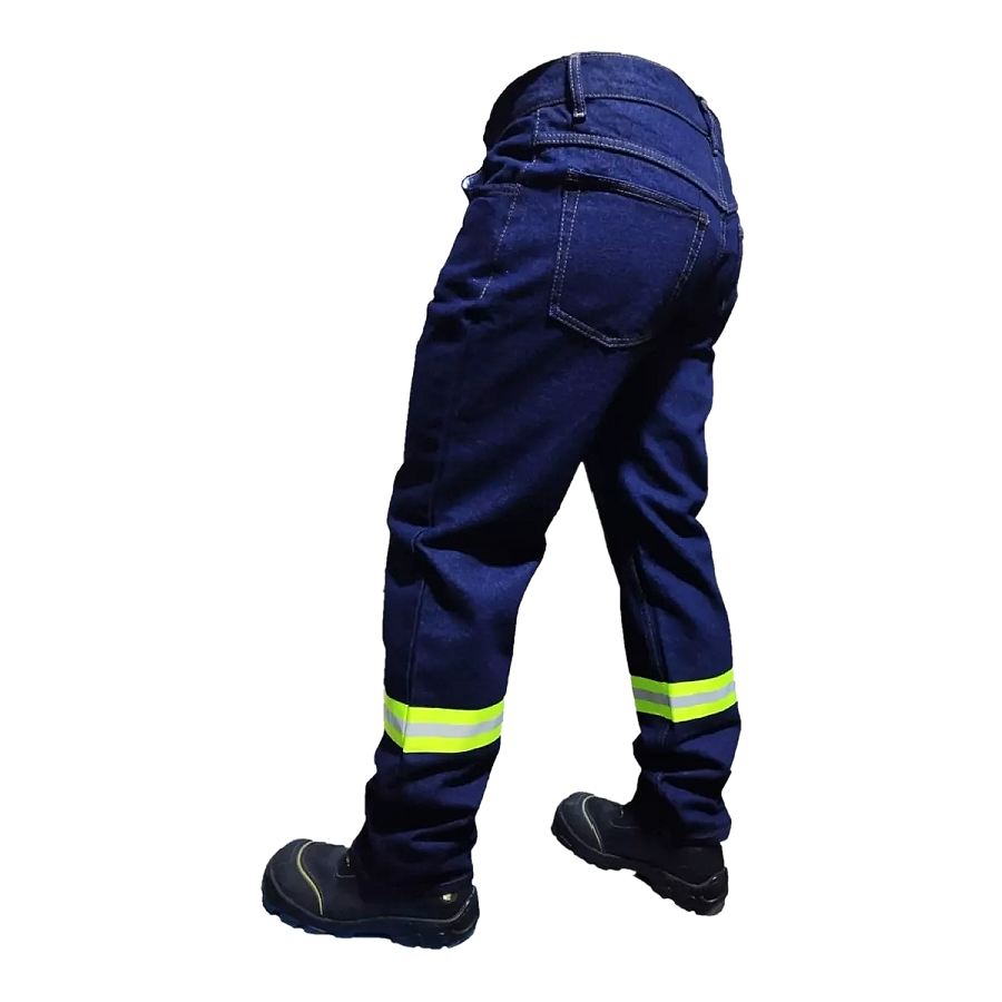 Pantalón de mezclilla 14 oz., corte recto. Unisex. Con reflejante bicolor verde/gris 2" en pantorrillas. Tallas: 28 al 36.