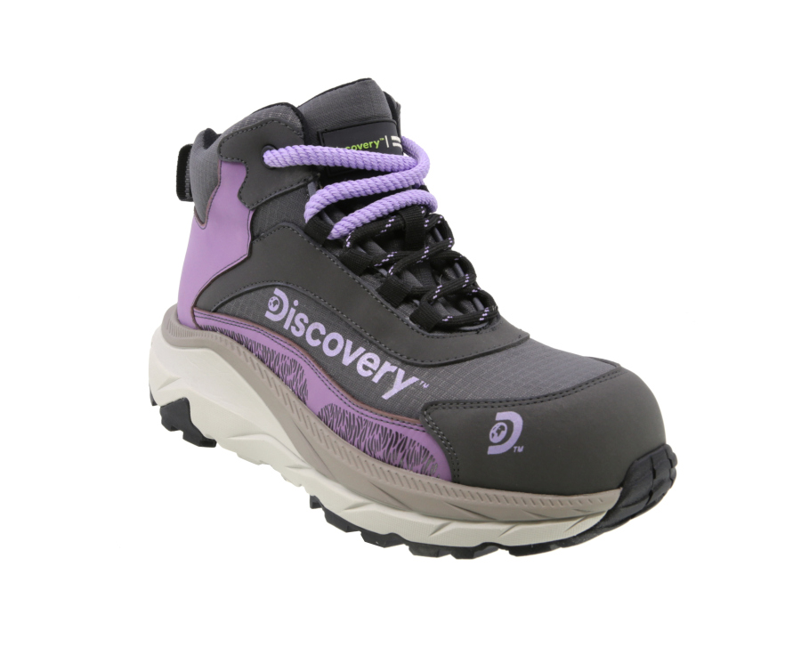 Tenis industrial Dama marca Discovery, corte sintético de Tecnocuero color gris y lila, agujeta bicolor, casquillo de poliamida. Suela doble densidad Hule+Phylon, resistente a grasas y aceites, antiderrapante. Tallas #22 al #27 enteros.